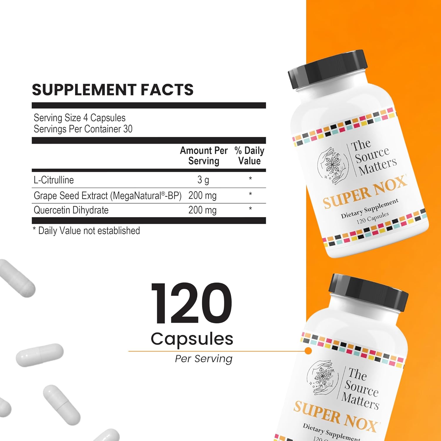 SUPER NOX by The Source Matters is formulated to support healthy circulation and vascular function through a targeted blend of L-Citrulline, Quercetin, and Grape Seed Extract. L-Citrulline, a natural precursor to L-arginine, promotes nitric oxide production, which plays a key role in supporting healthy blood flow and vasodilation. Quercetin, a well-known antioxidant, along with Grape Seed Extract, helps support endothelial function and vascular integrity. Designed to complement a healthy lifestyle, SUPER NOX provides nutrients that help maintain normal circulatory function and support overall vascular wellness. Suggested use: Take 4 capsules daily for optimal support.